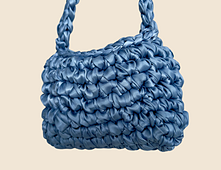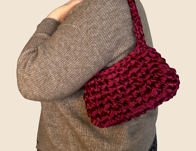 The Satin Pop Bag is a modern, structured mini shoulder bag crocheted using chunky satin ribbon. Designed to be both playful and polished, it creates a bold statement accessory with clean lines and a soft sheen finish.