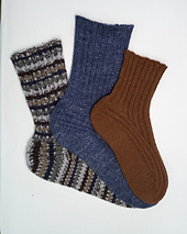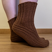 The socks are worked toe-up, allowing the leg length to be adjusted to suit the yarn available. Plan on approximately **100 g (400 m)** of fingering sock yarn for a standard leg length.