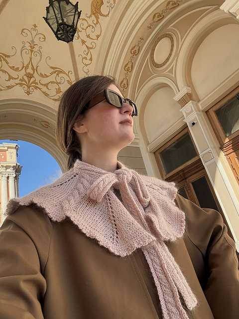 A textured knitted collar designed to add structure and interest to simple silhouettes. It features clean cable lines, subtle eyelet detailing, and a wide, scalloped shape that sits neatly over sweaters, shirts, or dresses.