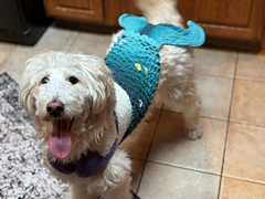 This pattern is for a mermaid dog sweater! The sweater can be adjusted to any size by following the modifications in the pattern. This sweater pattern has optional instructions to leave a hole for your dog’s harness clip, making it easy to attach their leash. The sweater is crocheted from the bottom to the top, starting with the tail, then the body, then the shell bra band, then the rest of the body, then the collar. The tail fin is crocheted separately and structured using wire. The bra straps are crocheted separately and sewn in place. The shell bra cups are crocheted separately, stuffed, and then sewn on to the body.