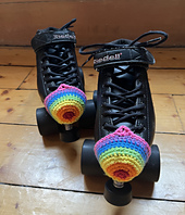 A quick and simple pattern for crochet toe guards for roller skates. This pattern is worked in the round and has information for both a solid color version, and for the color changes to give the rainbow stripes shown in the photo. This pattern was designed for Riedell R3 skates but should work for most skates with similar size toe stops or removable toe stops. Notes on modifying for larger skates and toe stops are provided.