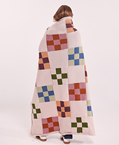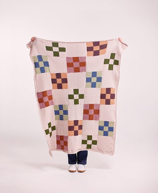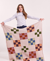 This Blanket is made up of 9 Patch Squares and Plain Squares that are seamed together. 9 Patch Squares use the intarsia method of changing colors. When changing from one color to the next, work up to the final pull through of a stitch, finishing with the new color. Use a separate ball of color for each section in a 9 Patch Square. A border is added after assembly.