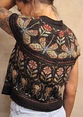 The Dragonfly Sweater is a top-down knit sweater with a large dragonfly pattern framed by smaller flowers and beetles.