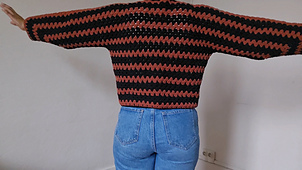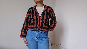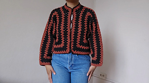 This long-sleeved cardigan features an original octagonal construction, worked in one piece with the timeless granny stitch. Starting from a central band, the fabric gradually expands to create the distinctive shape of the garment, combining classic crochet texture with a modern silhouette.