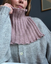 Iiris Neck Warmer is a delicate rib knit accessory that is worked in a fancy slip stitch rib from top down. The neck opening and bottom edge of the neck warmer are finished with cute ruffles. The work starts with a provisional cast-on, making it easy to adjust the height of the neck according to your own preferences. After that the work is divided into front and back pieces and knitted flat.