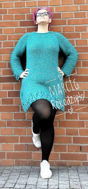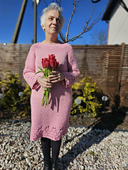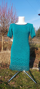 Sukienka wykonana szydełkiem. Ozdobny motyw kwiatów na rękawach dodaje jej uroku. A kwiaty na dole dają wrażenie kwiatowej łąki.