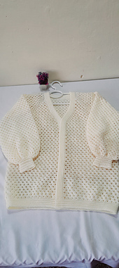 The cardigan is finished with a simple border and ribbed cuffs.