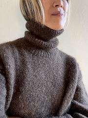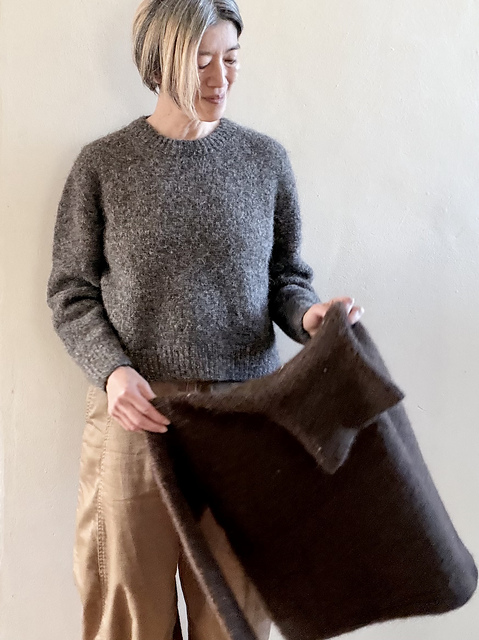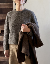 This sweater is knit top down. Start from the back shoulder, and pick up stitches from the shoulder slopes for the front shoulders and the neckline. Later, the yoke becomes a hybrid of creating sleeve caps from the front body and continuing usual body stitch increases at the same time to make this part of the sweater seamless. After separating the sleeves and the body, continue knitting each parts. Finally pickup stitches for the collar.