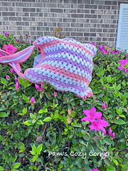 The bag is made with Lily Sugar’n Cream cotton yarn in three colors, which creates a sturdy and durable fabric that holds its shape well. The color changes highlight the granny stitch pattern and add a cheerful handmade touch.