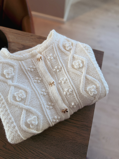 Petalia_cardigan er en feminin cardigan som kombinerer dobbel perlestrikk med delikate mønster. Den har dobbeltstrikket knappestolpe og hals, ermer og bol avsluttes med en dekorativ