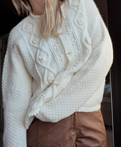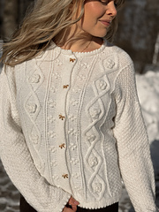 Petalia_cardigan is a feminine cardigan that combines double moss stitch with delicate pattern details. It features a double-knitted button band and neckline, and the sleeves and body are finished with a decorative picot edge. A crocheted flower adds a special finishing touch. The cardigan is knitted top- down, beginning with the back piece. The front pieces are then picked up, and the yoke is completed. Finally, the body, sleeves, and neckline are worked.