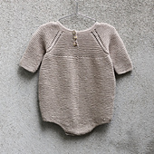 The first part of the yoke is worked back and forth to create an opening at mid-back. This opening is closed with 3 buttons. Afterwards, work is joined and the yoke and body are worked in the round down to the crotch where front and back crotch are finished separately back and forth. The yoke is shaped with raglan increases that create an eyelet pattern along the raglan seams. The sleeves are worked in the round and the sleeve length can easily be adjusted. The crotch is closed with 4 buttons to make diaper change easier.