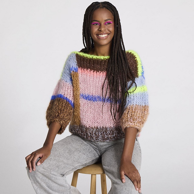 The sweater is worked from the top down: first the back is knitted, then the front. The side seams are sewn together up to the armholes. Stitches are then picked up in the armholes for the sleeves. The sleeves are knitted in the round and finished with an i-cord edge. The geometric pattern is worked using the intarsia technique, where the yarns are twisted on the wrong side of the work to prevent a hole from forming at the color change.