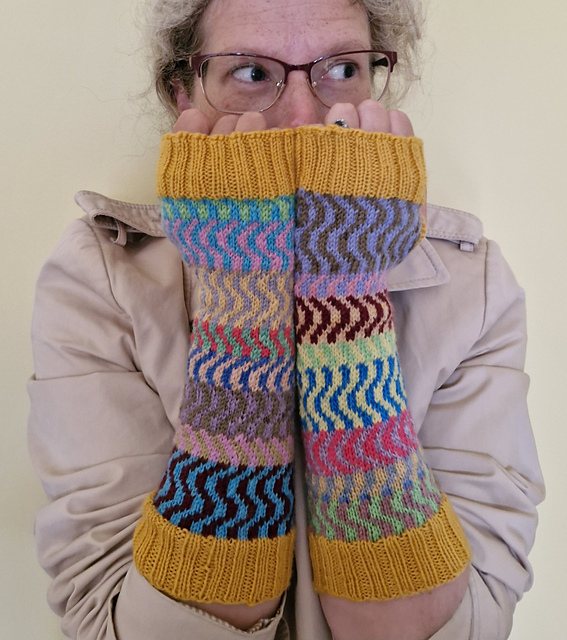 The handwarmers are a quick project which provides a simple introduction to stranded (Fair Isle) knitting. The end result has a cheerful, circus-like feel, and the stranding provides extra insulation.