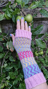 Construction method: The handwarmers are mostly knitted in the round from the bottom up, with a section knitted flat to provide a thumb hole. Very simple stranded knitting is used to provide the wave pattern in the stockinette section. The arm and hand cuffs are worked in 2 x 2 ribbing. Stitches are picked up round the thumb hole and the thumb cuff is worked in 1 x 1 ribbing.