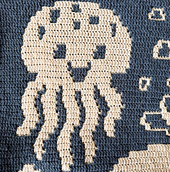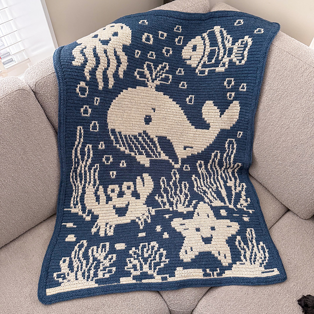 This overlay mosaic crochet design features a magical underwater scene inspired by ocean life and coral reefs. The blanket includes a whale, jellyfish, crab, starfish, fish and coral.