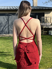 Create a stunning open-back crochet dress featuring crossed straps and a decorative bow on the back.