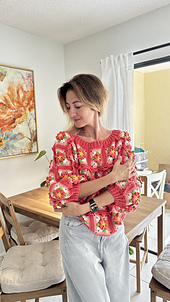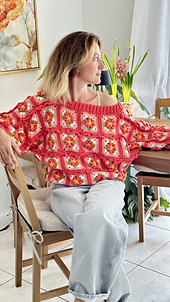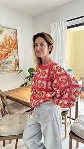 This cozy sweater is made from textured flower granny squares joined together to form a relaxed modern silhouette. The raised flower centers add beautiful dimension, while the soft pink, coral, and yellow tones give the sweater a cheerful, fresh look.
