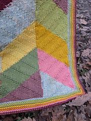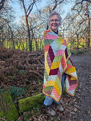 My blanket used almost every scrap of 10 100g skeins of hand-dyed DK yarn. You could do what I did and use 10 skeins of the same yarn, or you could make a scrappy blanket and use up random balls of similar yarn. It would work in any yarn weight, and you can make just about any size by varying the number of shapes in each row and the number of repeats of the shapes.