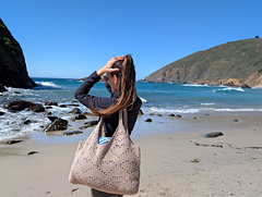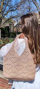 Heart Tote Bag is a modern crochet tote featuring a heart motif created with open spaces. The bag is worked from an oval base in the round, then continued in joined rows for the body and hearts. Handles are shaped and attached securely.