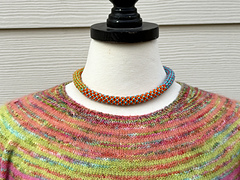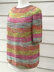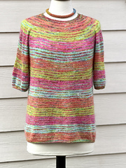 CORE 1 MOD 7 modifies the CORE 1 pattern by adding alternating stripes of Finito Fingering Hand Paint and four coordinating colors on Suri Silk Lace. This modification uses 1 × 1 ribbing for the neck edge, hem, and cuffs for the short length sleeves. Read on to find out how to apply MOD 7 to your CORE pattern.