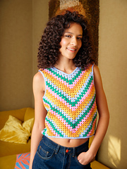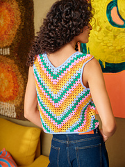 Worked from the V-neck down, the top begins in the round to form a square yoke—two points create the front and back V-necks, and two sit at the shoulders. Once the yoke is complete, the work is divided for front and back, which are worked separately to the armholes and then joined. The chevron edges are filled in to form an even hem. The slightly cropped sample can easily be lengthened thanks to the top-down construction.
