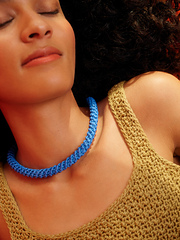 The necklace begins with a foundation chain to determine preferred diameter, which is then joined to be worked in the round. It is continued to be worked in the round to form a tube using single crochet patterning inserted into the second leg on the WS of the sc. As you work, you will be traveling counter-clockwise, and your crochet hook will be inserted from inside of the "tube" towards the outside. The travel patterning will attribute to the spiral textural look. Once desired length is achieved, both ends of the tube are sealed when attaching a closure clasp of your choice.