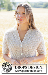 **Knitted jacket with short sleeves in DROPS Sky and DROPS Kid-Silk. Piece is knitted top down with raglan, V-neck, I-cord and honeycomb pattern. Size XS – XXXL.**