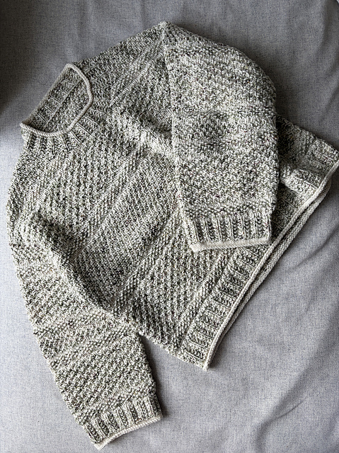 My sample was knitted with Heavy Merino by Knitting for Olive (100g = 250m) in color undyed held together with Olivia BFL by Olivia & Oliver Fibers (100g = 400m) Elder Flower. Olivia BFL can be substituted with Merino by Knitting for Olive.