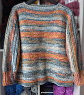 The Coastal Breeze Sweater is an easy crochet pullover worked in one piece using double crochet stitches. The pattern includes six sizes and two length options, so you can choose the fit you prefer. Variegated DK yarn with long colour changes work well creating soft stripes across the sweater without needing to change colours. Solid colours work too.