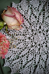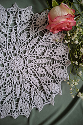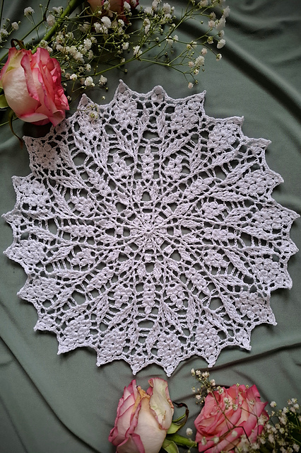 Łąkowa is an openwork doily/mandala with a leaf and flower motif, full of bobbles and post stitches. The pattern is non-repeatable, consisting of 20 rows. The file includes a pattern for both right-handed and left-handed crocheters. The doily/mandala can be made with three- or four-strand yarn or floss.