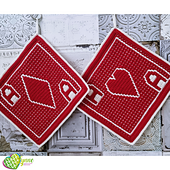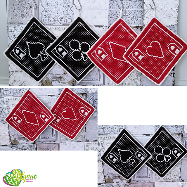 Worked in rows using overlay mosaic crochet, each potholder gradually reveals its suit motif as you crochet, turning simple stitches into striking graphic designs.