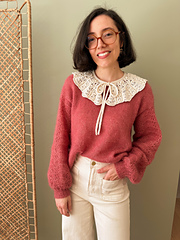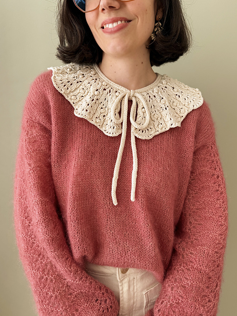 Ce col est tricoté avec un fil type DK, en aller-retour, de haut en bas et sans couture avec un fil de coton pour un look vintage. Les explications pour le point dentelle sont disponible sous forme de texte et de diagramme pour convenir au plus grand nombre.