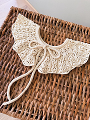 This collar is knitted back and forth, seamlessly from the top down with a DK cotton yarn for a vintage look. The explanation for the lace stitch is available in chart and written explanation.