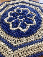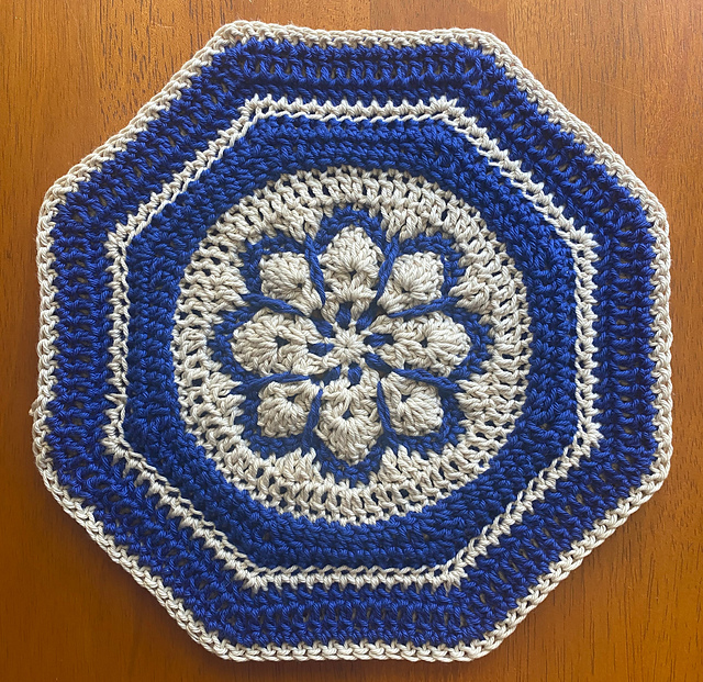 After round 15, the work should measure 6.25 inches in diameter using a 4.5mm hook and DK yarn. The completed octagon measures 10.25 inches across from edge to edge.