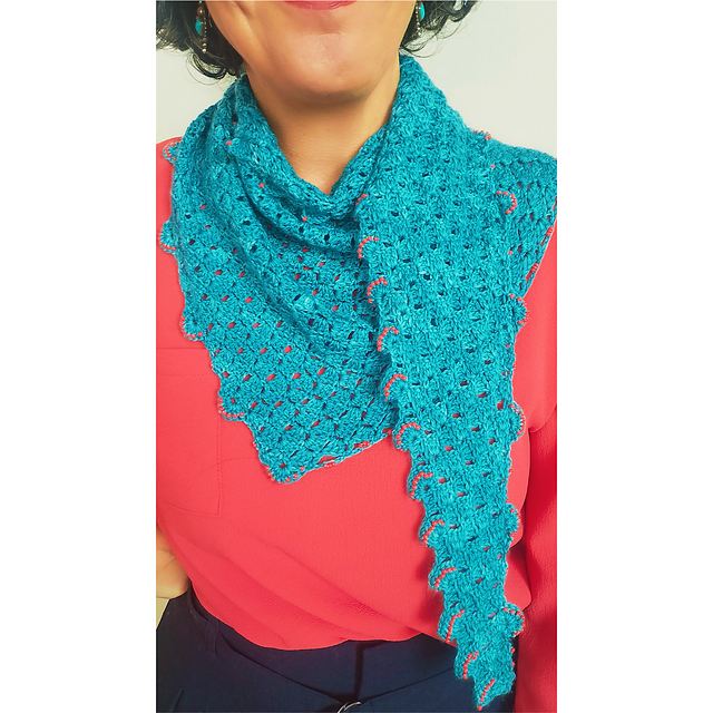 Este chal se trabaja desde una punta, formando un triángulo asimétrico mediante aumentos constantes en uno de los lados y disminuciones graduales en el lado opuesto. El punto utilizado crea una superficie texturizada y regular, aportando estructura al tejido sin hacerlo pesado.