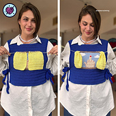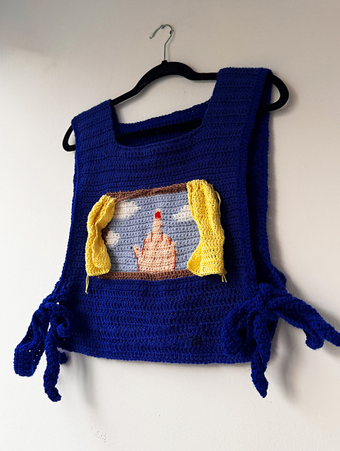 The “Up Yours Vest ” is an interactive crochet vest featuring a curtain panel that opens to reveal the bold design underneath. This pattern includes step-by-step written instructions to recreate the look.