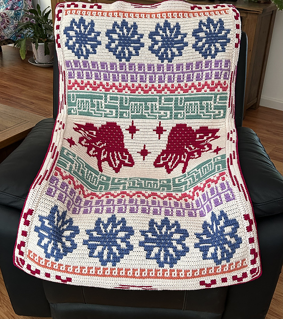 Bursts of Flowers is worked in single-colour rows using the overlay mosaic crochet technique, and is finished off with a simple envelope border to hide the loose ends.
