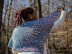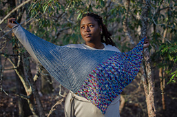 The shawl begins as a classic top-down triangle with a DC center spine, then the asymmetric wing is created.