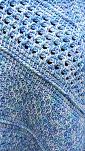 Using a soft DK-weight yarn in a calming cornflower blue, the design highlights a series of classic Tunisian stitches, including Honeycomb, Simple Stitch, Reverse Stitch, and Arrowhead Stitch. These textures flow naturally across the triangular shape, creating subtle interest and structure without complicated shaping.