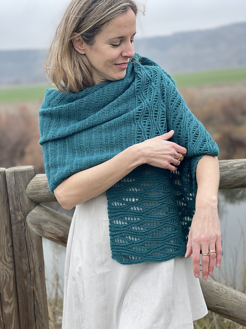 Tejida a partir del motivo Hoja Komorebi, esta estola combina un delicado calado que atrapa la luz con zonas más sobrias, creando un equilibrio entre ritmo y serenidad. Un proyecto dinámico: entretenido al inicio, meditativo en el centro y creativo en su tramo final.