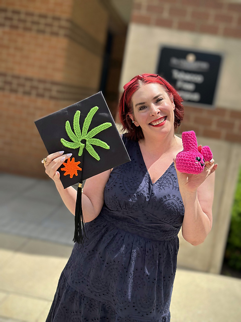 The exact cannabis leaf appliqué I crocheted for my own Medical Cannabis Science and Therapeutics master's graduation cap. Flat appliqué with a graduated seven-leaf design — smallest on the outside, longest in the middle — just like the real thing.