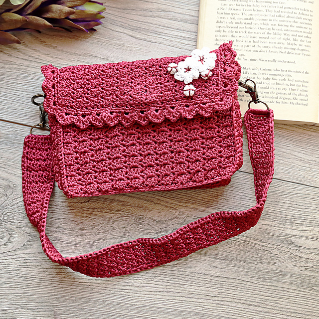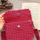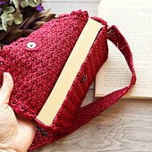 Yarn Used: 3mm nylon cord (ribbon), burgundy red (approximately 132g without lining and magnet closure); white 2mm nylon yarn and burgundy 1mm yarn for decoration