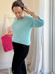 ‘Fluff it’ is a lightweight, vertically ribbed crochet sweater made from fluffy mohair or suri alpaca yarns. With a relaxed fit and shallow, gentle v-neck, this quick and simple crochet pullover is constructed from just two panels, making it easy to customise for different body and sleeve lengths.