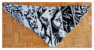 We start with an animal print, followed by the six animal motifs – zebra, panther, lion, elephant, giraffe and jaguar – and finish the shawl with the animal print once more.