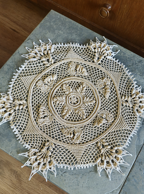 Ptashka is a richly textured doily featu strong text ring layered stitches, relief elements, clusters, and a decorative bird motif.