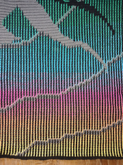 The colour changes from the ombre yarn shown in the photos was achieved by buying two cakes of ombre yarn (500 metre and 800 metre) and working from the inside out on one cake and the outside in on the second cake, this then gives the effect of yellow, orange, pink, blue, green, blue, pink, orange, yellow and end. If you use a single cake (1300 metres) your colour change will go from yellow, orange, pink, blue, green and end. The pattern has a few more rows than you will probably need to get to the end of a cake (I finished at row 296).