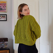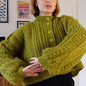 This design is constructed using a panel method, combining crochet cables, ribbed panels with puff stitches, and twisted stitch panels to create a textured, statement cardigan.
