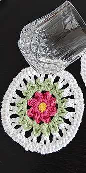 The coaster works up quickly and you can finish a couple in an evening. The wrapped single crochet is the one that takes a bit of time and getting used to.