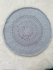 Magic ring, slip knot, Tunisian crochet in the round using double ended hook, Tunisian crochet technique (alternating forward and return passes), Tunisian knit stitch (tks), Tunisian full stitch (tfs), Tunisian knit stitch bind-off, blocking.